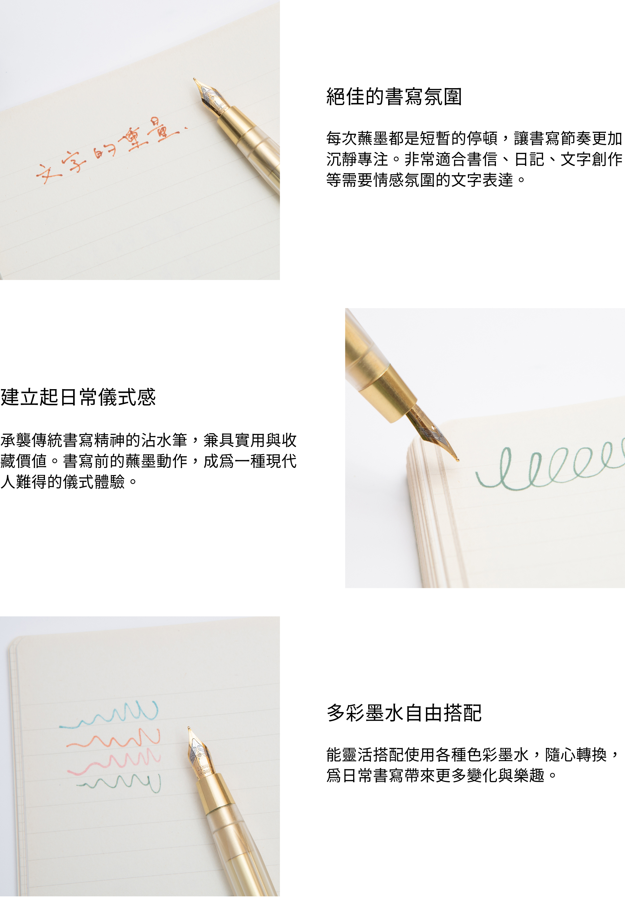 ※ 特選不鏽鋼鍍金筆尖,輕蘸即寫;圓潤的尖端構造減少阻力,手感極爲滑順,彈性柔韌、書寫手感軟硬適中,確保流暢穩定的書寫體驗。